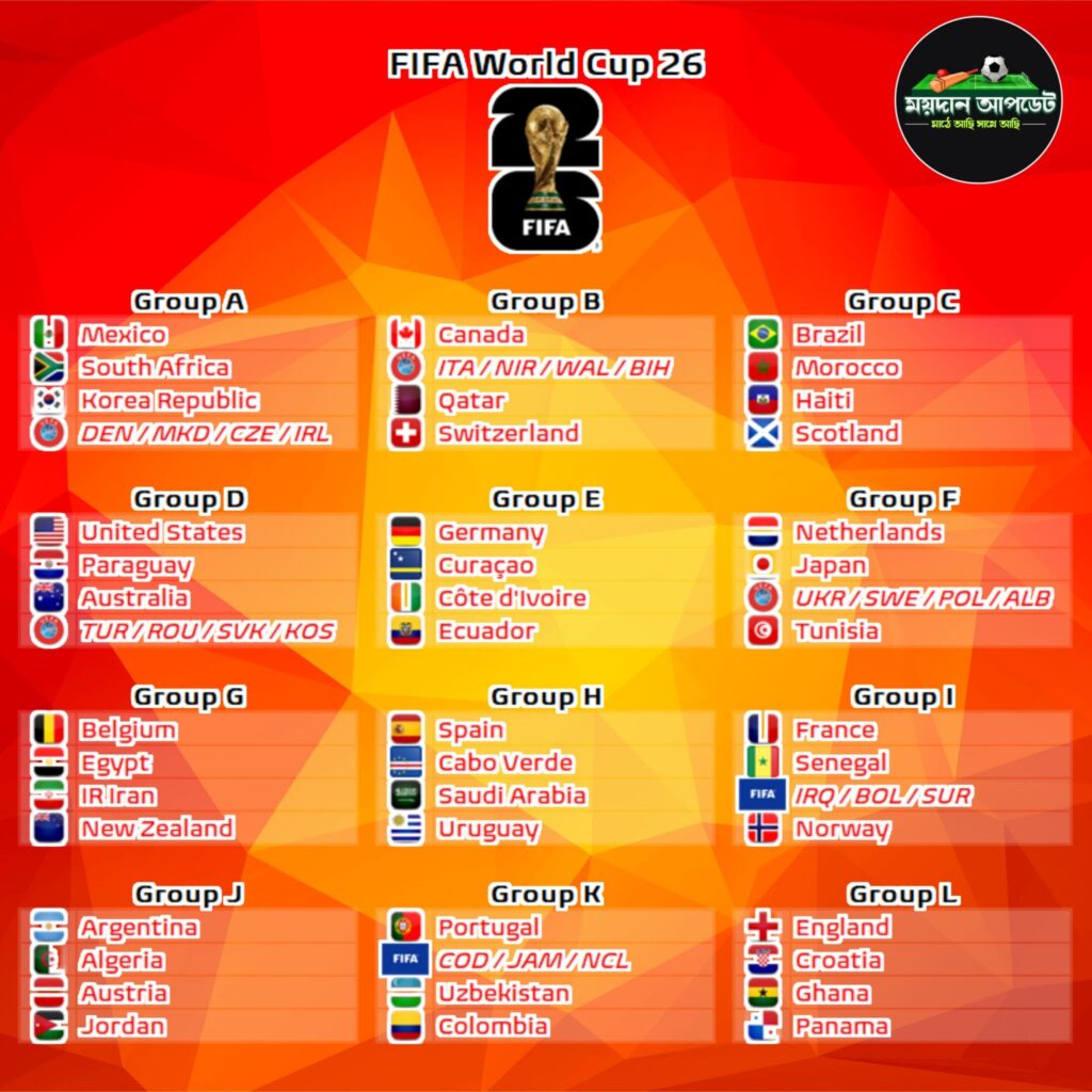 তবে বিশ্বকাপের মঞ্চে এবার কিছুটা কঠিন গ্রুপে রয়েছে পর্তুগাল। তারা রয়েছে K গ্রুপে। যাদের প্রতিপক্ষ শক্তিশালী কলম্বিয়া। এছাড়াও উজবেকিস্থান ও প্লে-অফ ১ এর জয়ী দল। তবে সিআর সেভেনের ভক্তরা মনে প্রাণে চাইছেন এবার বিশ্বকাপের ট্রফিটা রোনাল্ডোর হাতে দেখতে। কারণ জীবনে সমস্ত ধরনের ট্রফি পেলেও, এখনও পর্যন্ত কেবলমাত্র বিশ্বকাপের ট্রফিটাই অধরা থেকে গেছে রোনাল্ডোর কাছে। তাই এবার সেই স্বপ্নপূরণ হোক প্রত্যাশা সমর্থকদের। অপরদিকে আয়োজক তিন দেশ মেক্সিকো, কানাডা এবং আমেরিকাকে রাখা হয় যথাক্রমে A, B এবং C গ্রুপে। গ্রুপ এ-তে মেক্সিকো, কোরিয়া রিপাবলিকের সঙ্গে যুক্ত হয় দক্ষিণ আফ্রিকা। মেক্সিকো বনাম দক্ষিণ দক্ষিণ আফ্রিকা ম্যাচ দিয়ে শুরু হবে আসন্ন বিশ্বকাপ। যা ২০১০ বিশ্বকাপের স্মৃতি ফিরিয়ে আনল। ১৫ বছর আগেও এই দুই দেশ বিশ্বকাপের উদ্বোধনী ম্যাচে মুখোমুখি হয়েছিল।