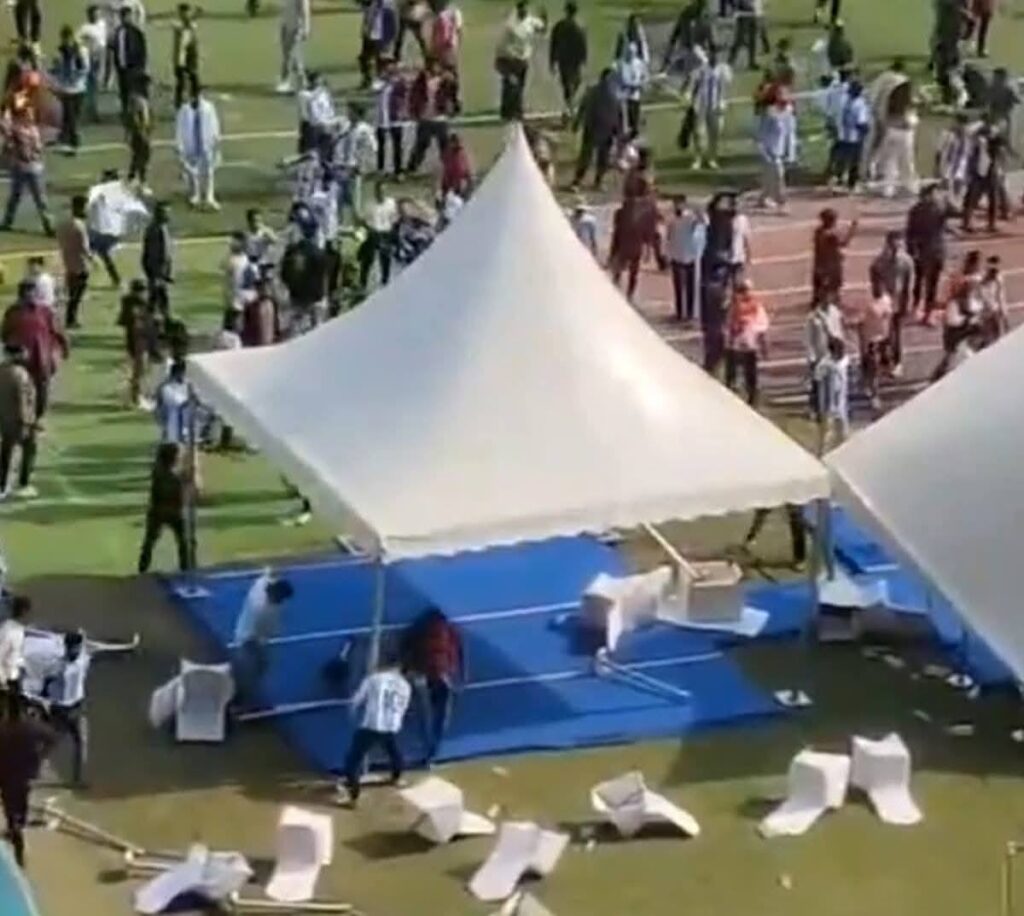 মেসিকে দেখতে না পেয়ে গ্যালারি থেকে ছোঁড়া হল চেয়ার,জলের বোতল। হাজার হাজার চেয়ার ও জলের বোতল ঝড়ের গতিতে ধেয়ে আসে মাঠে।