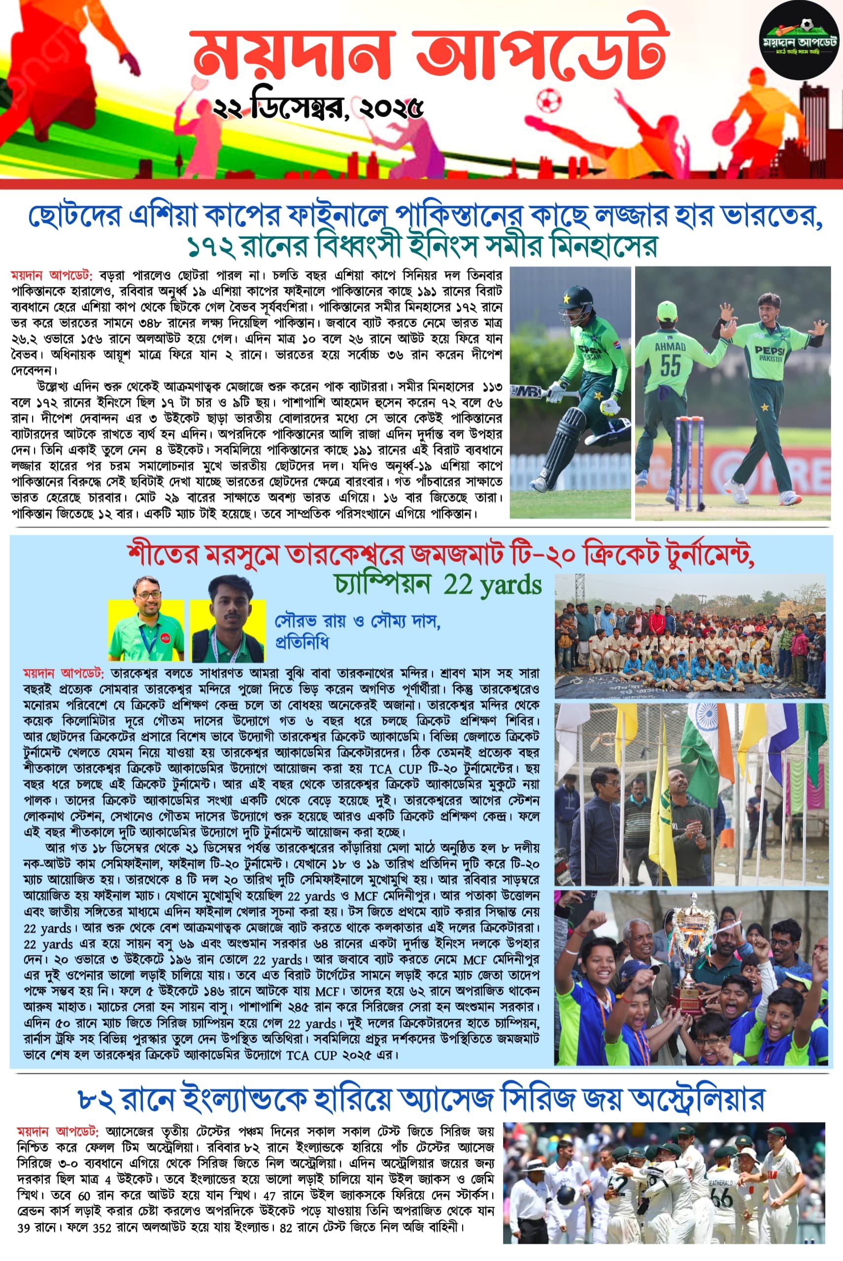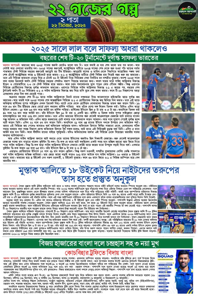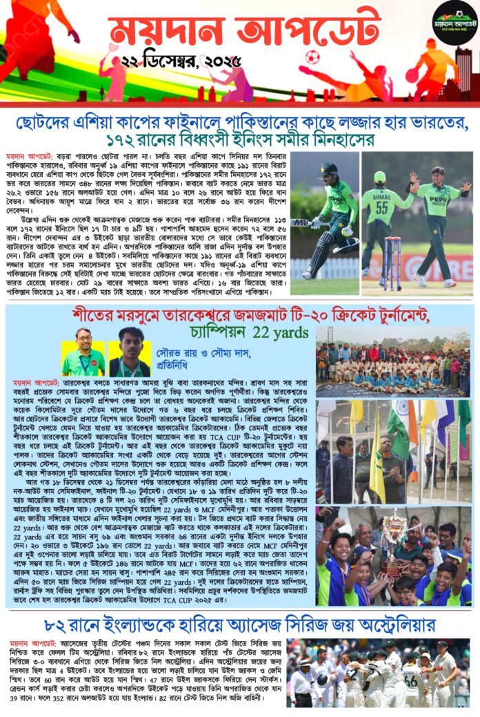Homeই-পেপারএকনজরে দেখে নিন আজকের সমস্ত খেলার খবর ই-পেপারSPORTS NEWS একনজরে দেখে নিন আজকের সমস্ত খেলার খবর দেখুন আজকের সমস্ত খেলার খবর By Sourav Roy December 22, 2025 0 137 Share FacebookTwitterWhatsAppCopy URL Tags#CRICKETNEWS#footballnews#maidanupdate Share FacebookTwitterWhatsAppCopy URL Previous articleশীতের মরসুমে তারকেশ্বরে জমজমাট টি-২০ ক্রিকেট টুর্নামেন্ট, চ্যাম্পিয়ন 22 yardsNext articleবিজয় হাজারেতে নামছেন রো-কো, তবে নিজেকে প্রমাণ করতে মরিয়া শুভমান! Sourav Royhttps://maidanupdate.com RELATED ARTICLES ক্রিকেট প্রথম সেমিতে কলকাতায় সাউথ আফ্রিকা বনাম নিউজিল্যান্ড,দ্বিতীয় সেমিফাইনালে ওয়াংখেড়েতে ইংল্যান্ড বনাম ভারত March 1, 2026 ক্রিকেট ৫ উইকেটে ওয়েস্ট ইন্ডিজকে হারিয়ে বিশ্বকাপের সেমিফাইনালে ভারত, অনবদ্য লড়াই সঞ্জু স্যামসনের March 1, 2026 ক্রিকেট ৫ উইকেটে জিম্বাবোয়েকে হারিয়ে বিশ্বকাপে অপরাজেয় প্রোটিয়ারা,সেমিতে প্রতিপক্ষ কিউয়িরা March 1, 2026 LEAVE A REPLY Cancel reply Comment: Please enter your comment! Name:* Please enter your name here Email:* You have entered an incorrect email address! Please enter your email address here Website: Save my name, email, and website in this browser for the next time I comment. Most Popular প্রথম সেমিতে কলকাতায় সাউথ আফ্রিকা বনাম নিউজিল্যান্ড,দ্বিতীয় সেমিফাইনালে ওয়াংখেড়েতে ইংল্যান্ড বনাম ভারত March 1, 2026 ৫ উইকেটে ওয়েস্ট ইন্ডিজকে হারিয়ে বিশ্বকাপের সেমিফাইনালে ভারত, অনবদ্য লড়াই সঞ্জু স্যামসনের March 1, 2026 ৫ উইকেটে জিম্বাবোয়েকে হারিয়ে বিশ্বকাপে অপরাজেয় প্রোটিয়ারা,সেমিতে প্রতিপক্ষ কিউয়িরা March 1, 2026 শুরুটা ভালো হল না ডায়মন্ড হারবারের! প্রথম ম্যাচেই ১ গোলে হার শ্রীনিধি ডেকান এফসির বিরুদ্ধে March 1, 2026 Load more