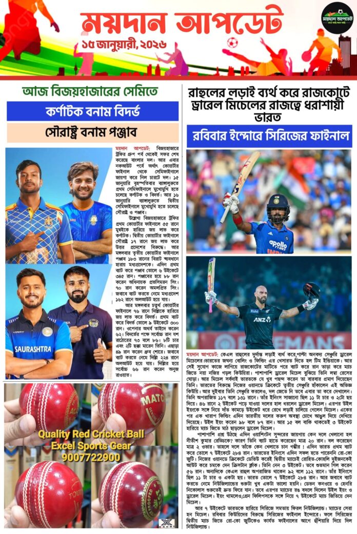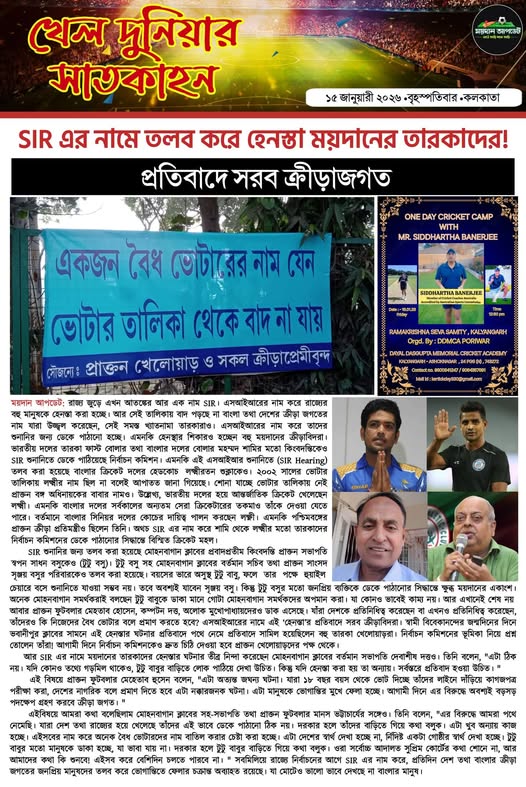 Homeই-পেপারসারাদিনের সেরা খেলার খবর দেখুন শুধুমাত্র ময়দান আপডেট E-Paper থেকে ই-পেপারSPORTS NEWS সারাদিনের সেরা খেলার খবর দেখুন শুধুমাত্র ময়দান আপডেট E-Paper থেকে খেলার বাছাই করা সেরা খেলার খবর আমাদের অনলাইন নিউজ পেপারে দেখুন By Sourav Roy January 15, 2026 0 129 Share FacebookTwitterWhatsAppCopy URL Tags#maidanupdate Share FacebookTwitterWhatsAppCopy URL Previous articleপয়েন্ট টেবিলে শীর্ষে আরসিবি, বুধবার থ্রিলারে ভরা ম্যাচে প্রথম জয় দিল্লি ওম্যান্সেরNext articleদয়াল দাশগুপ্ত ক্রিকেট অ্যাকাডেমিতে বিশেষ ক্লাস অস্ট্রেলিয়ার বাঙালি কোচ সিদ্ধার্থ ব্যানার্জীর Sourav Royhttps://maidanupdate.com RELATED ARTICLES ক্রিকেট প্রথম সেমিতে কলকাতায় সাউথ আফ্রিকা বনাম নিউজিল্যান্ড,দ্বিতীয় সেমিফাইনালে ওয়াংখেড়েতে ইংল্যান্ড বনাম ভারত March 1, 2026 ক্রিকেট ৫ উইকেটে ওয়েস্ট ইন্ডিজকে হারিয়ে বিশ্বকাপের সেমিফাইনালে ভারত, অনবদ্য লড়াই সঞ্জু স্যামসনের March 1, 2026 ক্রিকেট ৫ উইকেটে জিম্বাবোয়েকে হারিয়ে বিশ্বকাপে অপরাজেয় প্রোটিয়ারা,সেমিতে প্রতিপক্ষ কিউয়িরা March 1, 2026 LEAVE A REPLY Cancel reply Comment: Please enter your comment! Name:* Please enter your name here Email:* You have entered an incorrect email address! Please enter your email address here Website: Save my name, email, and website in this browser for the next time I comment. Most Popular প্রথম সেমিতে কলকাতায় সাউথ আফ্রিকা বনাম নিউজিল্যান্ড,দ্বিতীয় সেমিফাইনালে ওয়াংখেড়েতে ইংল্যান্ড বনাম ভারত March 1, 2026 ৫ উইকেটে ওয়েস্ট ইন্ডিজকে হারিয়ে বিশ্বকাপের সেমিফাইনালে ভারত, অনবদ্য লড়াই সঞ্জু স্যামসনের March 1, 2026 ৫ উইকেটে জিম্বাবোয়েকে হারিয়ে বিশ্বকাপে অপরাজেয় প্রোটিয়ারা,সেমিতে প্রতিপক্ষ কিউয়িরা March 1, 2026 শুরুটা ভালো হল না ডায়মন্ড হারবারের! প্রথম ম্যাচেই ১ গোলে হার শ্রীনিধি ডেকান এফসির বিরুদ্ধে March 1, 2026 Load more