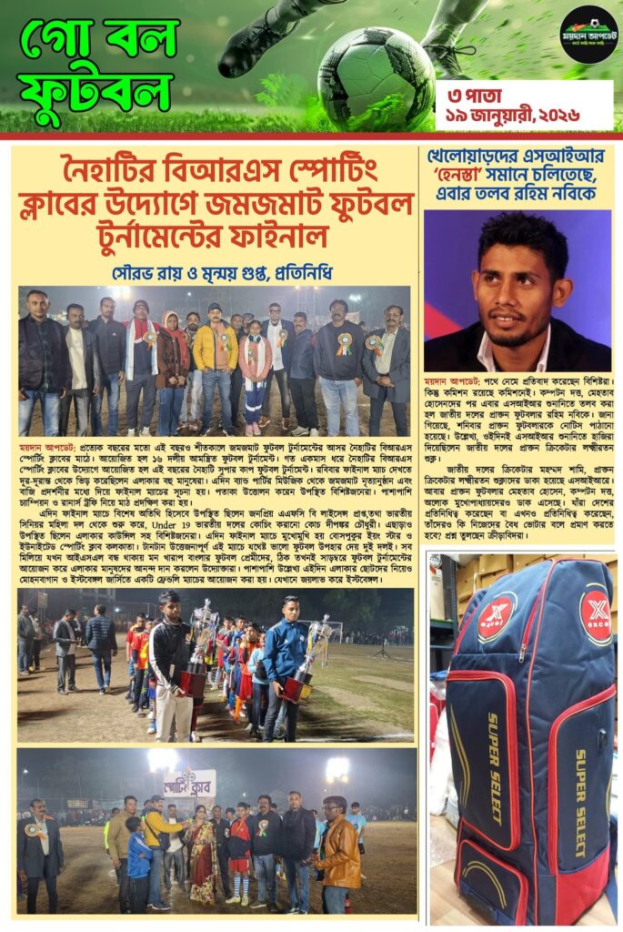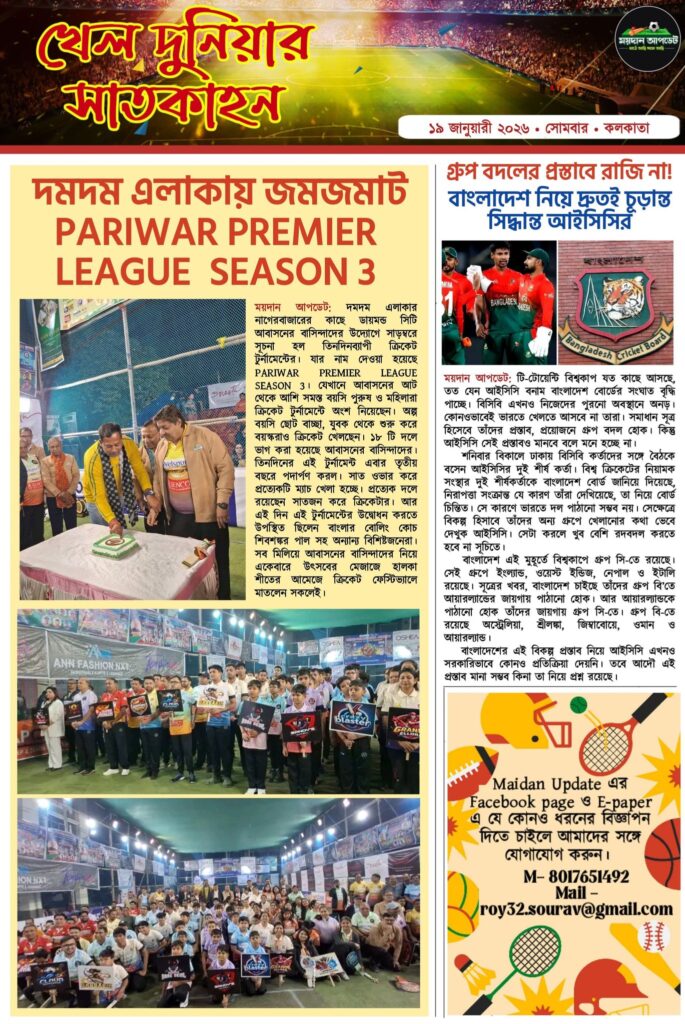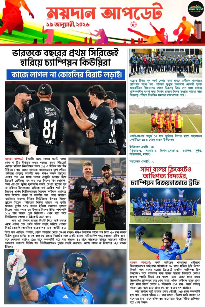 Homeই-পেপারএকনজরে দেখুন ময়দান আপডেট E-Paper থেকে আজকের গুরুত্বপূর্ণ খেলার খবর ই-পেপারSPORTS NEWS একনজরে দেখুন ময়দান আপডেট E-Paper থেকে আজকের গুরুত্বপূর্ণ খেলার খবর সারাদিনের খেলার গুরুত্বপূর্ণ খবর দেখুন অনলাইন নিউজ পেপারে By Sourav Roy January 19, 2026 0 83 Share FacebookTwitterWhatsAppCopy URL Tags#maidanupdate Share FacebookTwitterWhatsAppCopy URL Previous articleসাদা বলের ক্রিকেটেও আধিপত্য বিদর্ভের, চ্যাম্পিয়ন বিজয়হাজারে ট্রফিNext articleআনোয়ার আলি ইস্যুতে মৌন ফেডারেশন! বিরক্ত হয়ে এবার CAS এ আবেদন মোহনবাগানের Sourav Royhttps://maidanupdate.com RELATED ARTICLES কলকাতার ফুটবল মোহনবাগানের চাপের কাছে কার্যত নতি স্বীকার ফেরারেশনের, আংশিক গ্যালারি খুলে রাখার অনুমতি! March 4, 2026 ক্রিকেট হাইস্কোরিং ম্যাচের অপেক্ষায় ওয়াংখেড়ে,পাওয়ার হিটিং ভারতীয় অনুশীলনের মূল মন্ত্র! March 3, 2026 ক্রিকেট ইংল্যান্ডের বিরুদ্ধে পরিসংখ্যান থেকে শক্তির বিচারে এগিয়ে ভারত, তবে কেশব ব্যানার্জীর মতে ফাইনালে ভারত বনাম প্রোটিয়ারা March 3, 2026 LEAVE A REPLY Cancel reply Comment: Please enter your comment! Name:* Please enter your name here Email:* You have entered an incorrect email address! Please enter your email address here Website: Save my name, email, and website in this browser for the next time I comment. Most Popular মোহনবাগানের চাপের কাছে কার্যত নতি স্বীকার ফেরারেশনের, আংশিক গ্যালারি খুলে রাখার অনুমতি! March 4, 2026 হাইস্কোরিং ম্যাচের অপেক্ষায় ওয়াংখেড়ে,পাওয়ার হিটিং ভারতীয় অনুশীলনের মূল মন্ত্র! March 3, 2026 ইংল্যান্ডের বিরুদ্ধে পরিসংখ্যান থেকে শক্তির বিচারে এগিয়ে ভারত, তবে কেশব ব্যানার্জীর মতে ফাইনালে ভারত বনাম প্রোটিয়ারা March 3, 2026 আর্থিক জরিমানা দিলেও,ফাঁকা গ্যালারিতে মোহনবাগানকে খেলার নির্দেশ ফেডারেশনের! রাজনৈতিক অভিসন্ধী নয় তো? March 3, 2026 Load more
