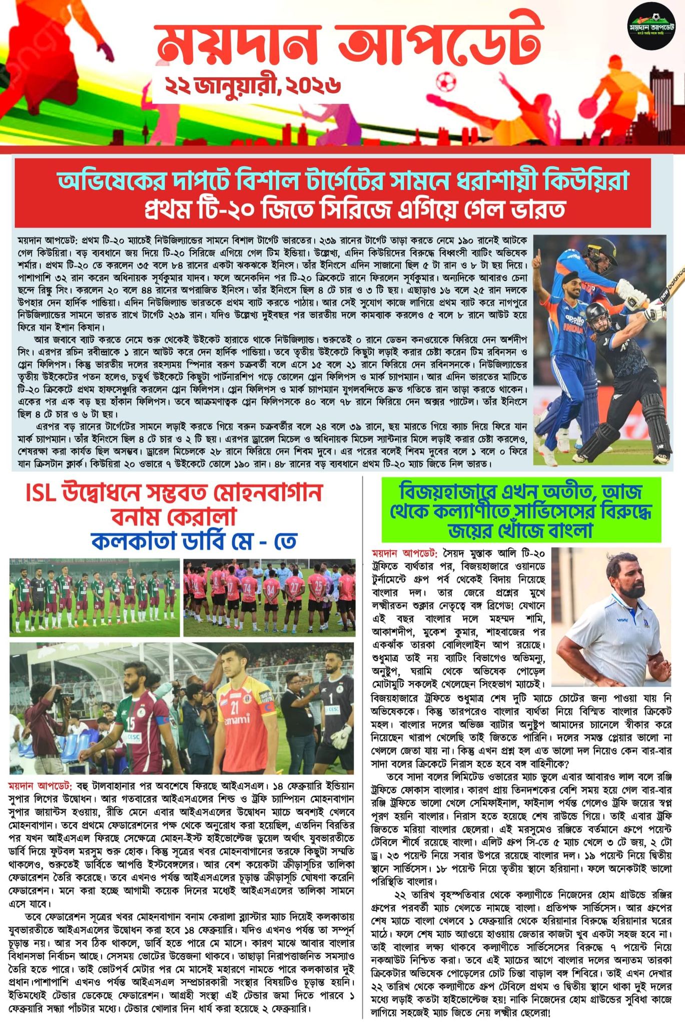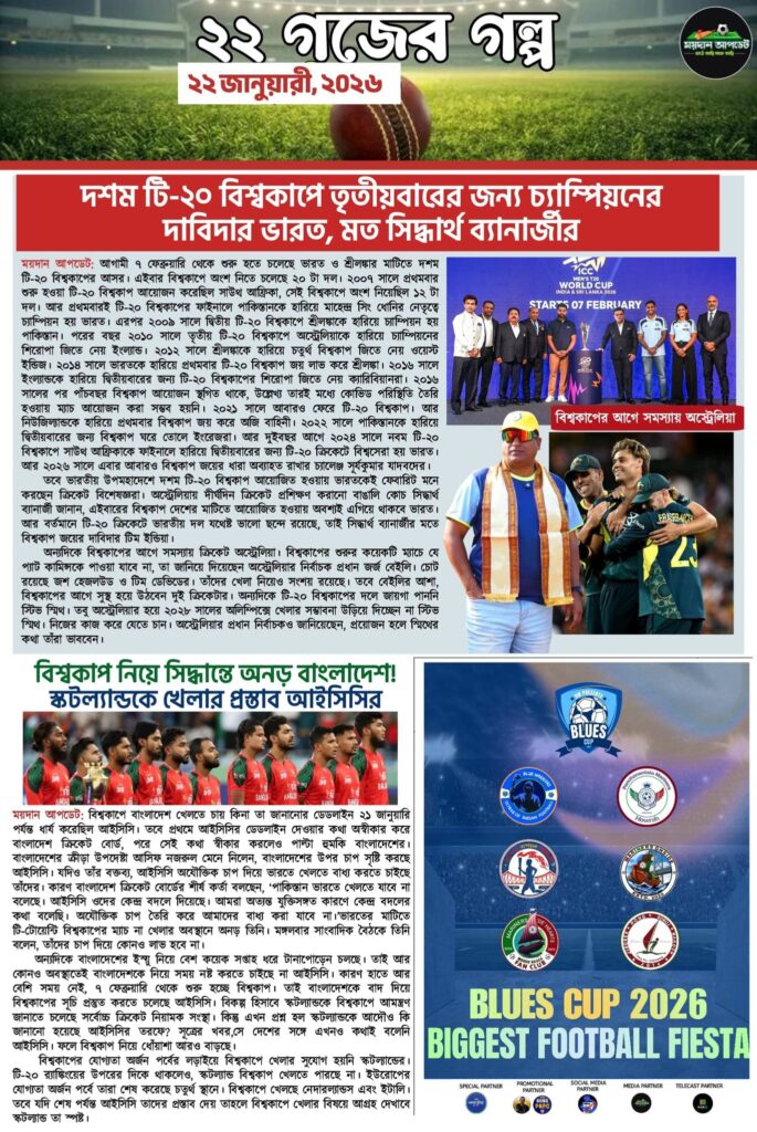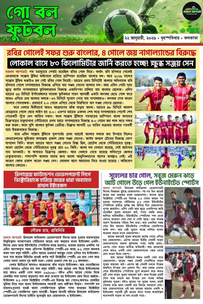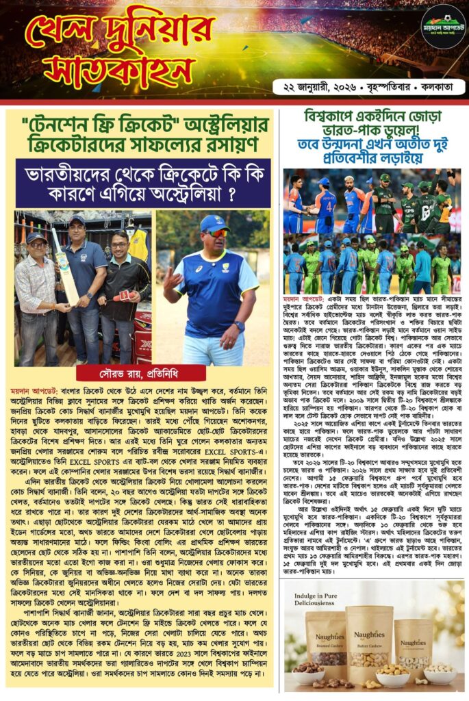 Homeই-পেপারখেলার সারাদিনের গুরুত্বপূর্ণ খবর নিয়ে ময়দান আপডেট E-Paper ই-পেপারSPORTS NEWS খেলার সারাদিনের গুরুত্বপূর্ণ খবর নিয়ে ময়দান আপডেট E-Paper By Sourav Roy January 22, 2026 0 105 Share FacebookTwitterWhatsAppCopy URL Tags#maidanupdate Share FacebookTwitterWhatsAppCopy URL Previous articleঅভিষেকের দাপটে বিশাল টার্গেটের সামনে ধরাশায়ী কিউয়িরা,৪৮ রানে জয়ী ভারতNext articleভারতীয়দের থেকে ক্রিকেটে কি কি কারণে এগিয়ে অস্ট্রেলিয়া ? জানালেন জনপ্রিয় কোচ সিদ্ধার্থ ব্যানার্জী Sourav Royhttps://maidanupdate.com RELATED ARTICLES কলকাতার ফুটবল মোহনবাগানের চাপের কাছে কার্যত নতি স্বীকার ফেরারেশনের, আংশিক গ্যালারি খুলে রাখার অনুমতি! March 4, 2026 ক্রিকেট হাইস্কোরিং ম্যাচের অপেক্ষায় ওয়াংখেড়ে,পাওয়ার হিটিং ভারতীয় অনুশীলনের মূল মন্ত্র! March 3, 2026 ক্রিকেট ইংল্যান্ডের বিরুদ্ধে পরিসংখ্যান থেকে শক্তির বিচারে এগিয়ে ভারত, তবে কেশব ব্যানার্জীর মতে ফাইনালে ভারত বনাম প্রোটিয়ারা March 3, 2026 LEAVE A REPLY Cancel reply Comment: Please enter your comment! Name:* Please enter your name here Email:* You have entered an incorrect email address! Please enter your email address here Website: Save my name, email, and website in this browser for the next time I comment. Most Popular মোহনবাগানের চাপের কাছে কার্যত নতি স্বীকার ফেরারেশনের, আংশিক গ্যালারি খুলে রাখার অনুমতি! March 4, 2026 হাইস্কোরিং ম্যাচের অপেক্ষায় ওয়াংখেড়ে,পাওয়ার হিটিং ভারতীয় অনুশীলনের মূল মন্ত্র! March 3, 2026 ইংল্যান্ডের বিরুদ্ধে পরিসংখ্যান থেকে শক্তির বিচারে এগিয়ে ভারত, তবে কেশব ব্যানার্জীর মতে ফাইনালে ভারত বনাম প্রোটিয়ারা March 3, 2026 আর্থিক জরিমানা দিলেও,ফাঁকা গ্যালারিতে মোহনবাগানকে খেলার নির্দেশ ফেডারেশনের! রাজনৈতিক অভিসন্ধী নয় তো? March 3, 2026 Load more