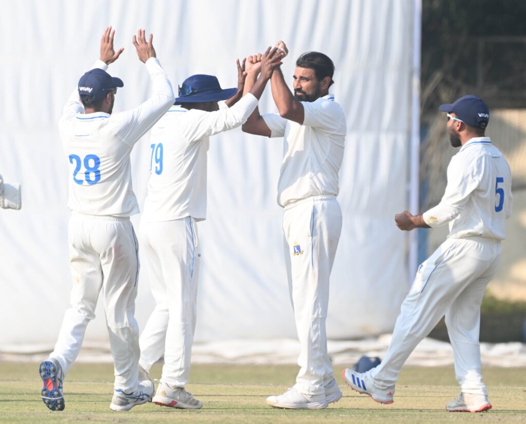 জবাবে ব্যাট করতে নেমে শুরুটা মোটেই ভালো যায় নি জম্মু-কাশ্মীরের। শুরুতেই জম্মুর ইনিংসে বড়সড় ধাক্কা দেন মহম্মদ শামি ও মুকেশ কুমার। মাত্র ১৩ রানে ৩ উইকেট হারিয়ে ফেলে প্রথমবার সেমিফাইনালে ওঠা জম্মু-কাশ্মীর। তবে এরপর চতুর্থ জুটিতে কাশ্মীরকে ভালো লড়াইয়ের পথে টেনে নিয়ে যান দুই অভিজ্ঞ ব্যাটার অধিনায়ক পরশ দোগরা ও আব্দুল সামাদ। তাঁদের দারুণ একটা পার্টনারশিপে ভর করে খেলায় প্রত্যাবর্তন করে জম্মু-কাশ্মীর। দুইজনেই দলকে হাফসেঞ্চুরি উপহার দেন। তবে এরপর ৮২ রানে আব্দুল সামাদকে ফিরিয়ে দেন মহম্মদ শামি। সামাদের ইনিংসে ছিল ১২ টা চার। এরপরই পরশ দোগরাকে ৫৮ রানে ফিরিয়ে দেন মুকেশ কুমার। ফলে আবারও ম্যাচে ফিরে আসে বাংলা। দিনের শেষে কিছুটা লড়াই করার চেষ্টা করেন আবিদ মুস্তাক। দিনের শেষে জম্মু-কাশ্মীরের স্কোর ৫ উইকেটে ১৯৮ রান। ২৬ রানে অপরাজিত আকিব মুস্তাক। বাংলার হয়ে ৩ উইকেট নেন মহম্মদ শামি এবং ২ উইকেট নেন মুকেশ কুমার। তবে এখনও বাংলার থেকে ১৩০ রানে পিছিয়ে জম্মু-কাশ্মীর।
