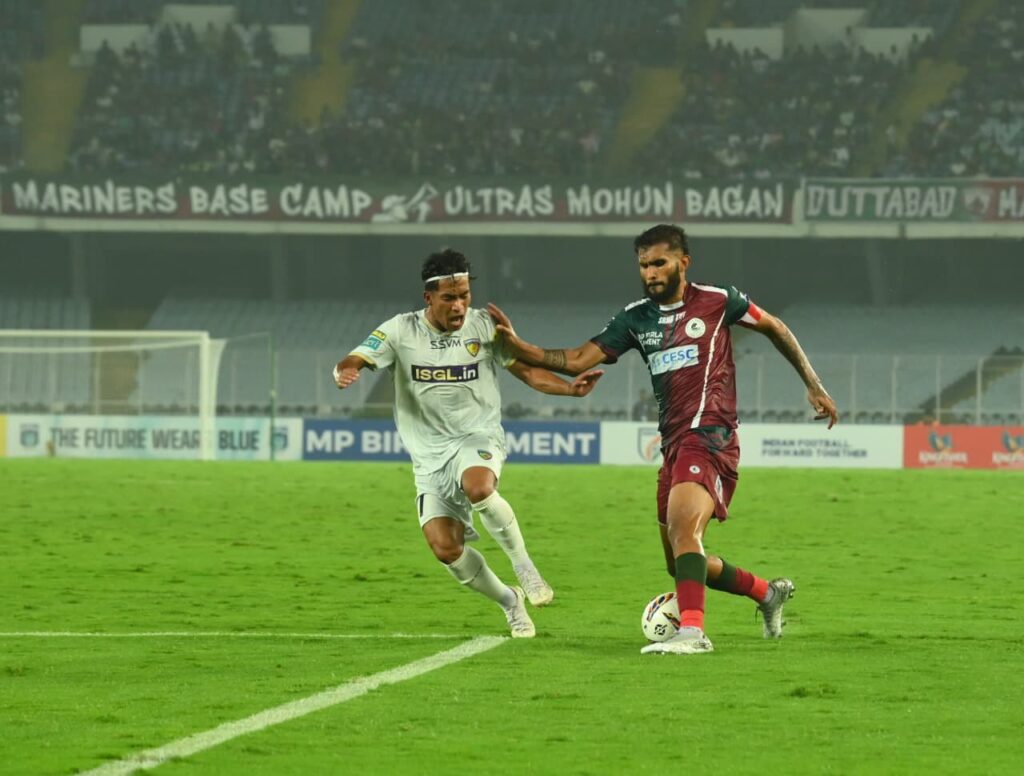 ম্যাচের ৩৬ মিনিটে চেন্নাইয়ের ফুটবলার ইরফানকে আঘাত করেন অভিষেক সিং। ফলে হলুদ কার্ড দেখানো হয় অভিষেককে। তবে প্রথমার্ধে ঘন-ঘন আক্রমণে মোহনবাগান উঠলেও, অনবদ্য ডিফেন্সের মাধ্যমে সবুজ-মেরুন ফুটবলারদের আক্রমণ রুখে দেন চেন্নাইয়ের ফুটবলাররা। ৪২ মিনিটে লিস্টনের শটে গোলের সুযোগ তৈরি হয় তবে চেন্নাইয়ের পোস্টে লেগে বল ফিরে আসে, ফলে কোনও গোল আসেনি। ম্যাচে ৪ মিনিট অতিরিক্ত সময় দেওয়া হয় প্রথমার্ধে। তবে খেলার ৪৯ মিনিটে চেন্নাইয়ের গোলরক্ষককে কার্যত বোকা বানিয়ে সহজেই গোল করে মোহনবাগানকে প্রথমার্ধের শেষে এগিয়ে দেন জেমি ম্যাকলারেন। ফলে ১-০ এগিয়ে যায় মোহনবাগান। উচ্ছ্বাসে ফেটে পড়েন সমর্থকরা।