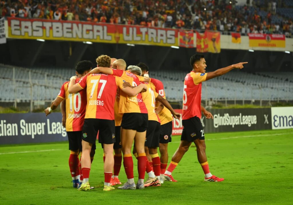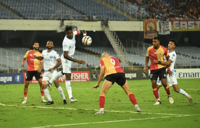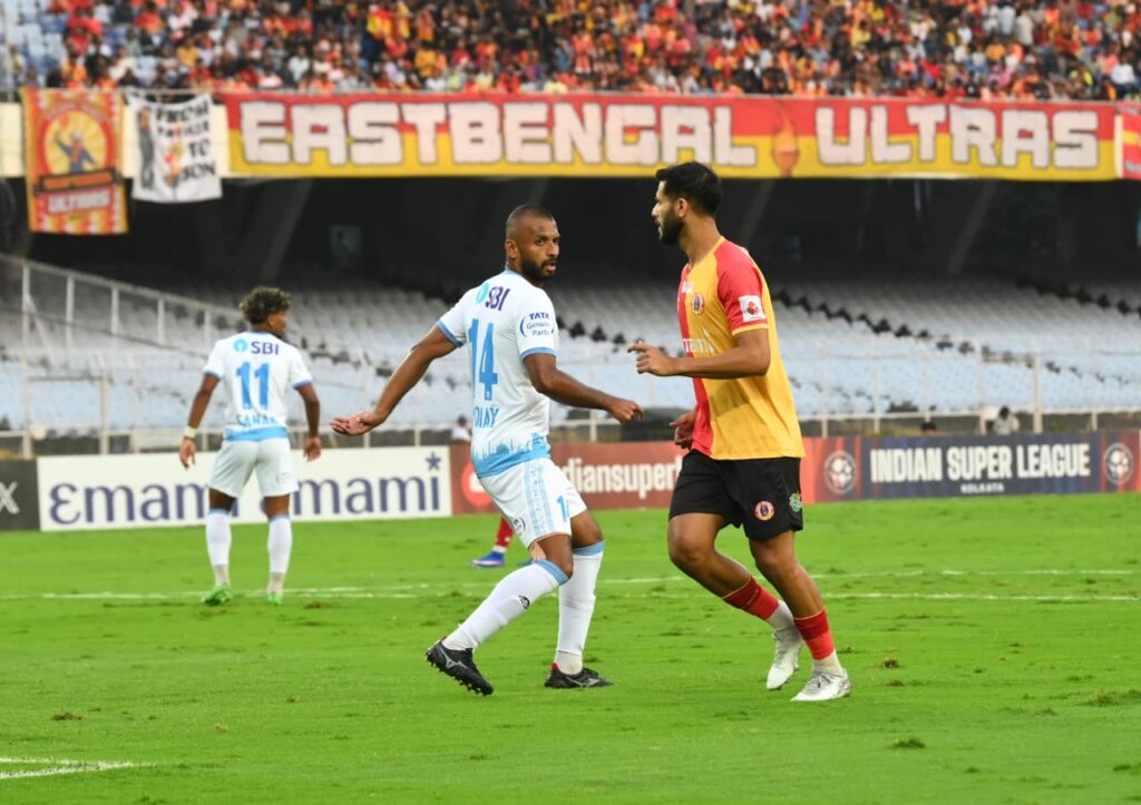 ময়দান আপডেট: চলতি আইএসএলে পর-পর দুই ম্যাচে নর্থ-ইস্ট ইউনাইটেড ও স্পোর্টিং ক্লাব দিল্লির বিরুদ্ধে জিতে পয়েন্ট টেবিলে দ্বিতীয় স্থানে থেকে, জামশেদপুরের বিরুদ্ধে খেলতে নামে ইস্টবেঙ্গল এফসি। দুই ম্যাচে তারা ৭ গোল করে, খেয়েছে মাত্র ১ গোল। অন্যদিকে জামশেদপুরও প্রথম ম্যাচে মহামেডানের বিরুদ্ধে, দ্বিতীয় ম্যাচে পঞ্জাব এফসির বিরুদ্ধে জিতে যুবভারতীতে ইস্টবেঙ্গলের বিপক্ষে খেলতে নেমেছিল। আর এদিন লাল-হলুদ জার্সিতে অভিষেক হল ডেনমার্কের সেন্টার ফরোয়ার্ড অ্যান্টন সোজবার্গের। প্রথমার্ধেই ইউসুফ ইজ্জেজারি-অ্যান্টন সোজবার্গ যুগলবন্দিতে প্রথম একাদশ সাজান কোচ অস্কার ব্রুজো। শুরুতেই হলুদ কার্ড দেখেন জামশেদপুর এফসির সানান মহম্মদ। এরপর ৭ মিনিটে জামশেদপুরের হয়ে ইস্টবেঙ্গলের পোস্ট লক্ষ্য করে শট নেন মেসি বাউলি, কিন্তু অফসাইটের জন্য গোল বাতিল হয়। ১১ মিনিটে জিকসনের দূরপাল্লার শট পোস্টের পাশ দিয়ে বেরিয়ে যায়। ১৩ মিনিটে আবারও ইস্টবেঙ্গলের পোস্টে গোলের সুযোগ তৈরি করেন সানান মহম্মদ কিন্তু ফের অফসাইটে গোল বাতিল হয়।