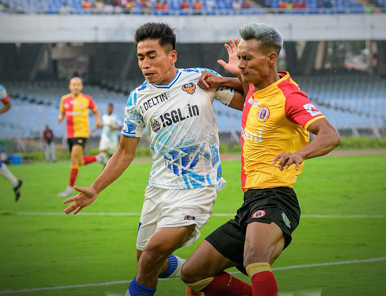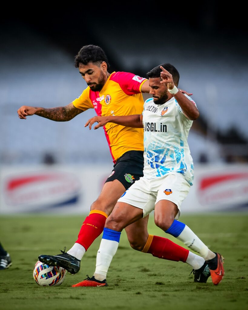 ম্যাচের ৭ মিনিটে দুর্দান্ত ট্যাকেল আনোয়ার আলির। ইশান পন্ডিতার শট রুখে দিয়ে গোল বাঁচালেন তিনি। ১১ মিনিটে দূরপাল্লার ভালো শট নেন মিগুয়েল, যদিও গোল আসেনি। ১৩ মিনিটে আবারও দুর্দান্ত ডিফেন্স আনোয়ার আলির। ইশান পন্ডিতার শট রুখে দেন আনোয়ার। ১৭ মিনিটে ইউসুফ হিজ্জেজারির বাড়ানো বলে মিগুয়েলের শটে গোল রুখে দেন সন্দেশ জিঙ্গান। ২৩ মিনিটে ড্রাজিসকে ফাউল করেন এডমুন্ড। ২৭ মিনিটে বিপিনের বাড়ানো বলে সহজ গোলের সুযোগ নষ্ট করেন ইউসুফ হিজ্জেজারি। ৩৫ মিনিটে ভালো গোলের সুযোগ তৈরি করেন এফসি গোয়ার হয়ে ব্রাইসন, গোল রুখে দেন গোলকিপার প্রভসুখন গিল। ৩৯ মিনিটে আবারও ইস্টবেঙ্গলের পোস্ট লক্ষ্য করে শট নেন ইশান পন্ডিতা, তবে সুযোগ রুখে দেন প্রখসুখন গিল। কয়েক সেকেন্ডের ব্যবধানে ফের ইশানের শট রুখে দেন গিল। ৪১ মিনিটে বরিস সিং এর শট পোস্টে লেগে ফিরে আসে। ফলে প্রথমার্ধে ইস্টবেঙ্গলের বিরুদ্ধে ঘন-ঘন আক্রমণে উঠতে দেখা যায় এফসি গোয়াকে। তবে ৪৩ মিনিটে রশিদের দূরপাল্লার শট গোয়ার পোস্টে লেগে ফিরে আসে। ৩ মিনিট অতিরিক্ত সময় দেওয়া হয়। তবে ওই সময়ে আর কোনও গোল আসেনি। ফলে প্রথমার্ধ শেষ হয় গোলশূন্য ভাবে।