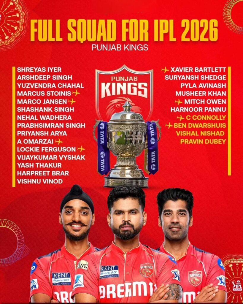 আসন্ন আইপিএলের নিলামেও বিশেষ কোনও চমক দিতে পারেনি পঞ্জাব কিংস। তাদের দলে নেওয়া হয়েছে ৩১ বছর বয়সি অস্ট্রেলিয়ার বাঁ-হাতি ফাস্ট বোলার James Dwarshuis কে। তাকে পঞ্জাব কিনেছে ৪ কোটি ৪০ লক্ষ টাকায়। এছাড়াও দলে নিয়েছে অস্ট্রেলিয়ার বাঁ-হাতি ব্যাটার কপার কনওলেকে। এছাড়া দলে নেওয়া হয়েছে প্রবীন দুবে, বিশাল নিশাদ,মুশির খানদের মতো কিছু ভারতীয় ক্রিকেটারদের। পাশাপাশি গত মরসুমের যে সমস্ত তারকা ক্রিকেটাররা দলে রয়েছেন তারা হলেন, অধিনায়ক শ্রেয়স আইয়ার, ভারতীয় দলের তারকা পেসার আর্শদীপ সিং, স্পিনার যুগবেন্দ্র চাহাল, প্রিয়াংশ আর্য, প্রভসিমরন সিং এর মতো ভারতীয় ক্রিকেটাররা। বিদেশীদের মধ্যে রয়েছেন-মার্কোস স্টয়নিস, মার্কো জনসন,লকি ফার্গুসন, আফগান ব্যাটার তথা মিডিয়াম পেসার আজমাতুল্লা উমরজাইদের মতো ক্রিকেটাররা। এদের মধ্যে লকি ফার্গুসনকে আইপিএল মরসুমের শুরুতে পঞ্জাব দলে দেখা যাবে না। কারণ তিনি তাঁর সদ্যজাত সন্তান ও পরিবারের সঙ্গে কিছুদিন সময় কাটাতে চান।ফলে খুব একটা তারকার সমাহার তাদের দলে নেই, তার মধ্যে লকি ফার্গুসনও শুরুতে না থাকায় বেশ কিছুটা চাপের মধ্যে থেকেই আইপিএলে লড়াই শুরু করতে চলেছে পঞ্জাব।