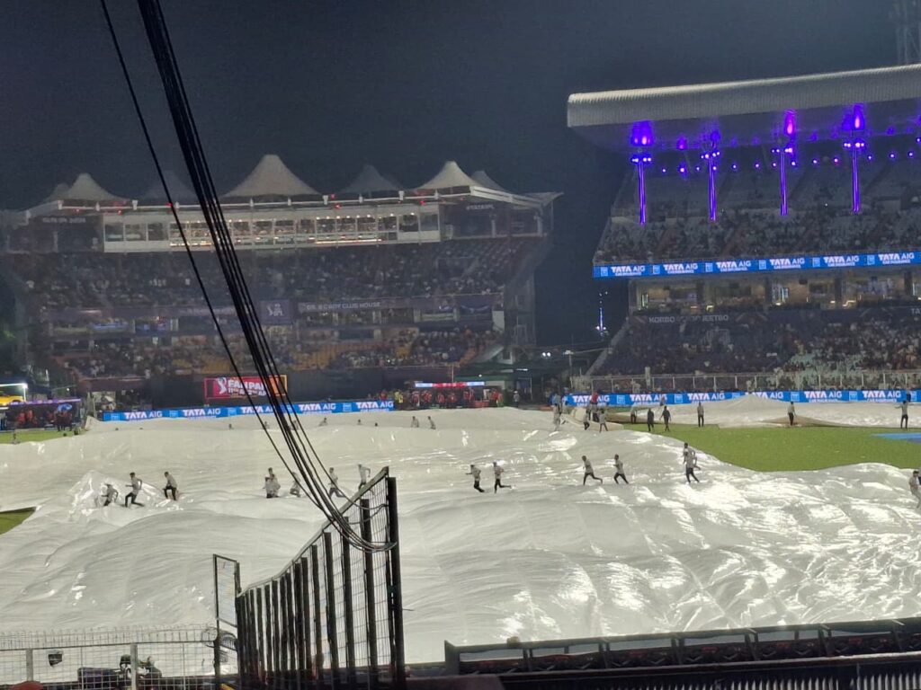 প্রায় রাত ১০ টা ৪৫ মিনিট নাগাদ বৃষ্টি বন্ধ হওয়ায়, আম্পায়র থেকে শুরু করে দুই দলের প্লেয়ার থেকে কোচ সকলেই মাঠে নেমে মাঠ পরিদর্শন করেন। মাঠে দেখা যায় ইডেনের পিচ কিউরেটর সুজন মুখার্জী থেকে শুরু করে সিএবি সভাপতি সৌরভকে। তারাও দীর্ঘক্ষণ মাঠ ঘুরে দেখেন। তবে মাঠের জল শুকিয়ে কোনও ভাবেই খেলা শুরু করা এত রাতে সম্ভব ছিল না। শেষ পর্যন্ত রাত ১১-টা নাগাদ ম্যাচ বাতিল ঘোষণা করা হয়। ম্যাচ বাতিল হওয়ায়, দুই দলের মধ্যে ১ পয়েন্ট করে ভাগ করে দেওয়া হয়। সবমিলিয়ে সোমবার ইডেনে বরুণ দেবের আর্শীবাদে প্রথম ১ পয়েন্টের খাতা খুলে কিছুটা স্বস্তি ফিরে পেল বাংলার ঘরের দল কলকাতা নাইট রাইডার্স।