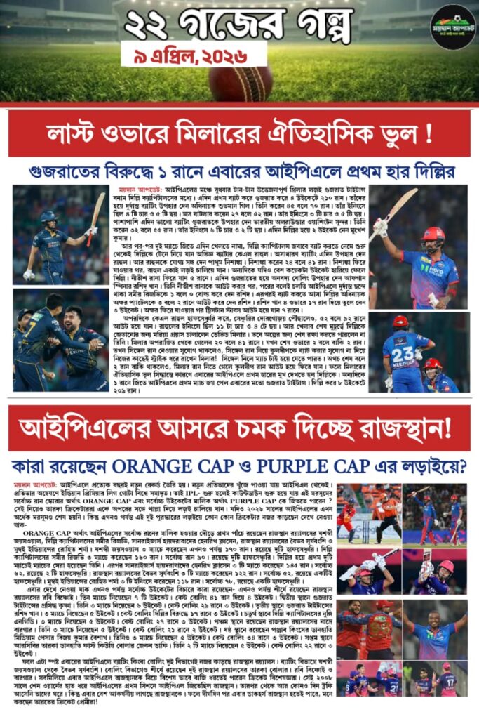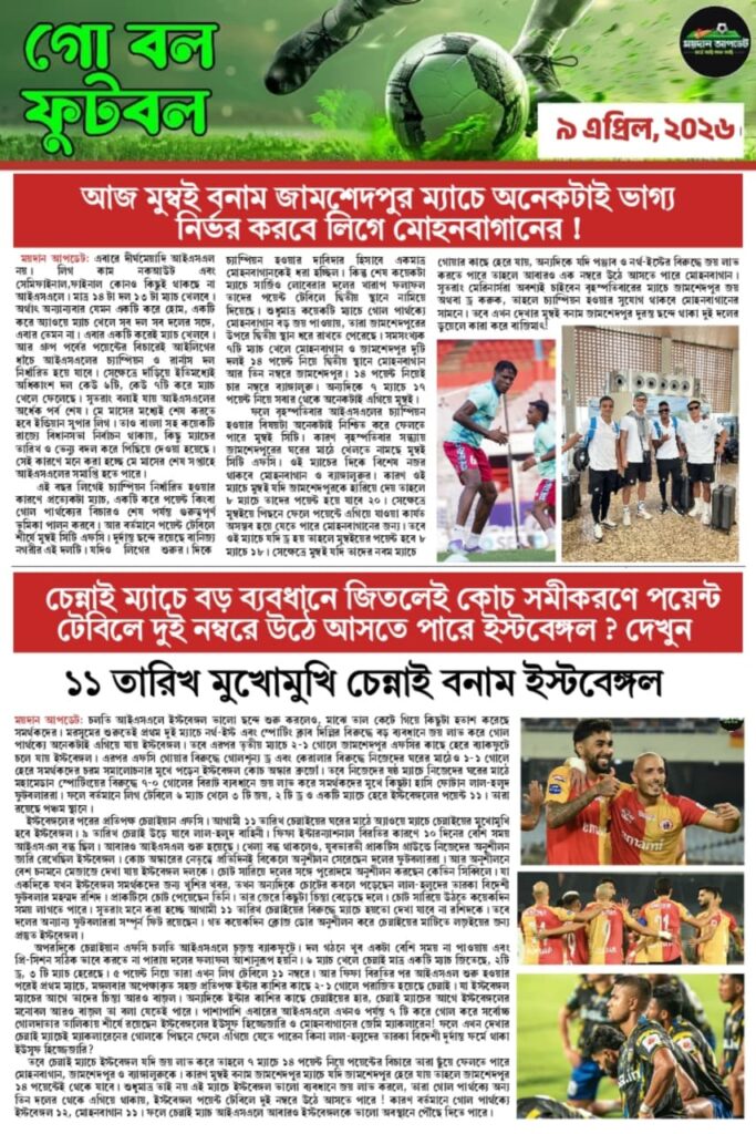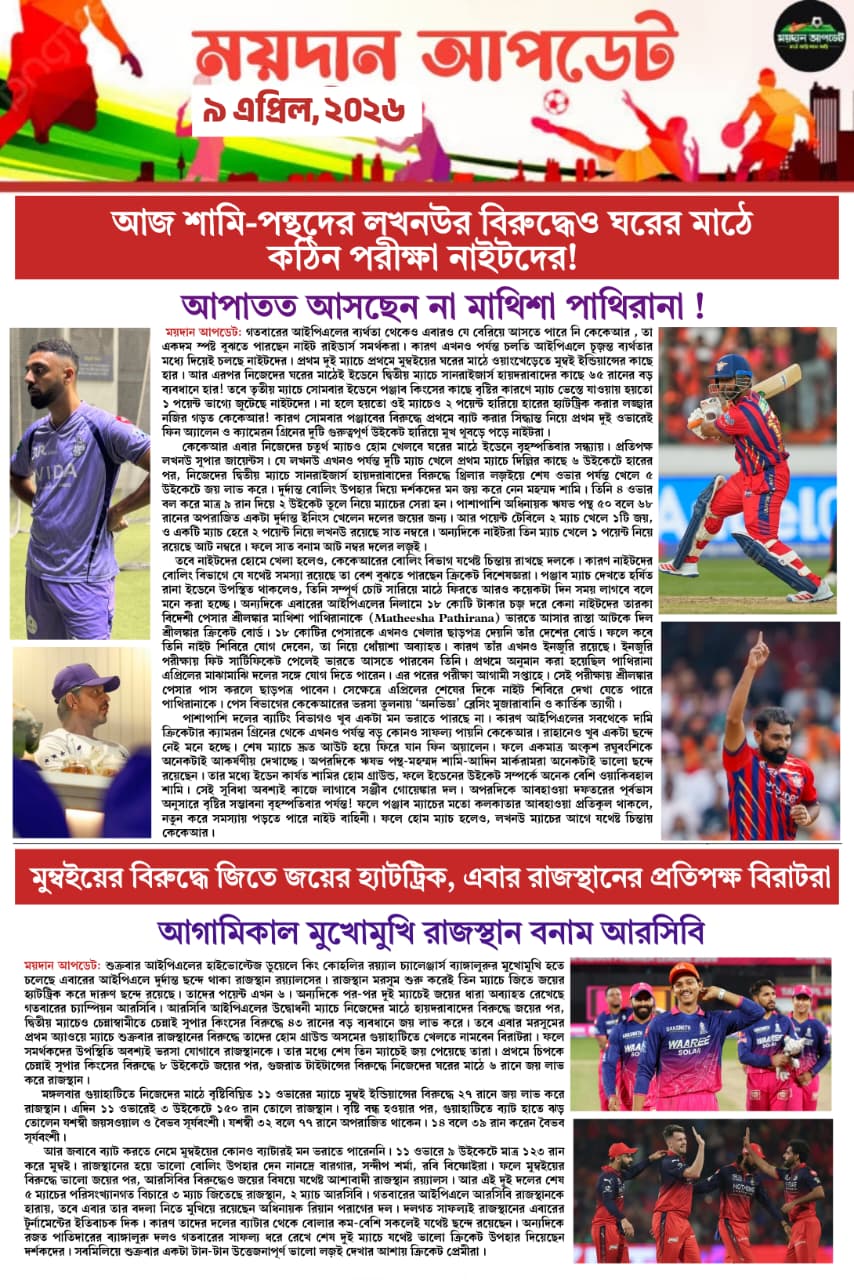 Homeই-পেপারসারাদিনের বাছাই করা খেলার গুরুত্বপূর্ণ খবর একনজরে দেখুন MAIDAN UPDATE-অনলাইন নিউজ পেপারে SPORTS NEWSই-পেপার সারাদিনের বাছাই করা খেলার গুরুত্বপূর্ণ খবর একনজরে দেখুন MAIDAN UPDATE-অনলাইন নিউজ পেপারে সারাদিনের বাছাই করা খেলার গুরুত্বপূর্ণ খবর By Sourav Roy April 9, 2026 0 22 Share FacebookTwitterWhatsAppCopy URL Tags#maidanupdate#sportsnews Share FacebookTwitterWhatsAppCopy URL Previous articleএএফসি অনুর্ধ্ব ২০ মহিলা এশিয়ান কাপে লড়াকু ফুটবল উপহার দিয়েও, ভাগ্যের ফেরে বিদায় ভারতের!Next article১ গোলে এগিয়ে থেকেও, জামশেদপুরের বিরুদ্ধে ১-১ গোলে ড্র করল মুম্বই Sourav Royhttps://maidanupdate.com RELATED ARTICLES কলকাতার ফুটবল বাংলার নববর্ষে চিরাচরিত প্রথা মেনে বারপুজোর মধ্যে দিয়ে ময়দানে নতুন মরসুমের সূচনা April 15, 2026 আইপিএল চেন্নাইয়ের ঘরের মাঠেও চূড়ান্ত ব্যাটিং ব্যর্থতা নাইটদের! ৩২ রানে জয়ী সিএসকে April 14, 2026 SPORTS NEWS মাহেশের চোট গুরুতর! ব্যাঙ্গালুরু ম্যাচের আগে চিন্তায় ইস্টবেঙ্গল April 14, 2026 LEAVE A REPLY Cancel reply Comment: Please enter your comment! Name:* Please enter your name here Email:* You have entered an incorrect email address! Please enter your email address here Website: Save my name, email, and website in this browser for the next time I comment. Most Popular বাংলার নববর্ষে চিরাচরিত প্রথা মেনে বারপুজোর মধ্যে দিয়ে ময়দানে নতুন মরসুমের সূচনা April 15, 2026 চেন্নাইয়ের ঘরের মাঠেও চূড়ান্ত ব্যাটিং ব্যর্থতা নাইটদের! ৩২ রানে জয়ী সিএসকে April 14, 2026 মাহেশের চোট গুরুতর! ব্যাঙ্গালুরু ম্যাচের আগে চিন্তায় ইস্টবেঙ্গল April 14, 2026 ক্রিকেট ক্লাব অফ ঢাকুরিয়ার আয়োজিত মিলেনিয়াম কাপ ফাইনালে নববর্ষের দিনে মুখোমুখি সিসিডি ও অ্যামেচার ক্রিকেট ক্লাব April 14, 2026 Load more